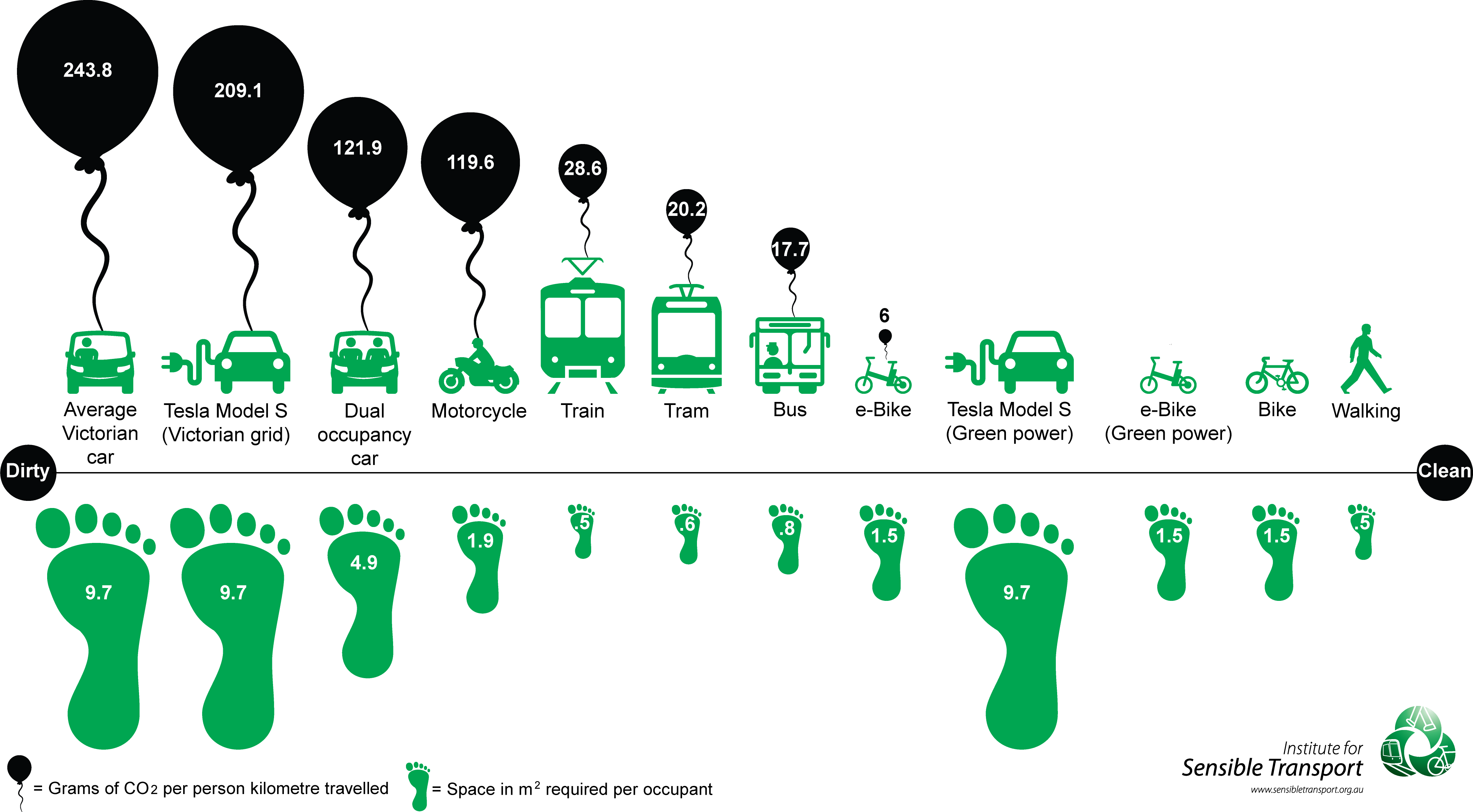 The infographic below illustrates the stark contrast between dirty and clean transport modes and the space each mode consumes. This figure uses black balloons to illustrate the emissions, on a per person, per kilometre basis. The footprints represent the space consumption of different modes of transport.