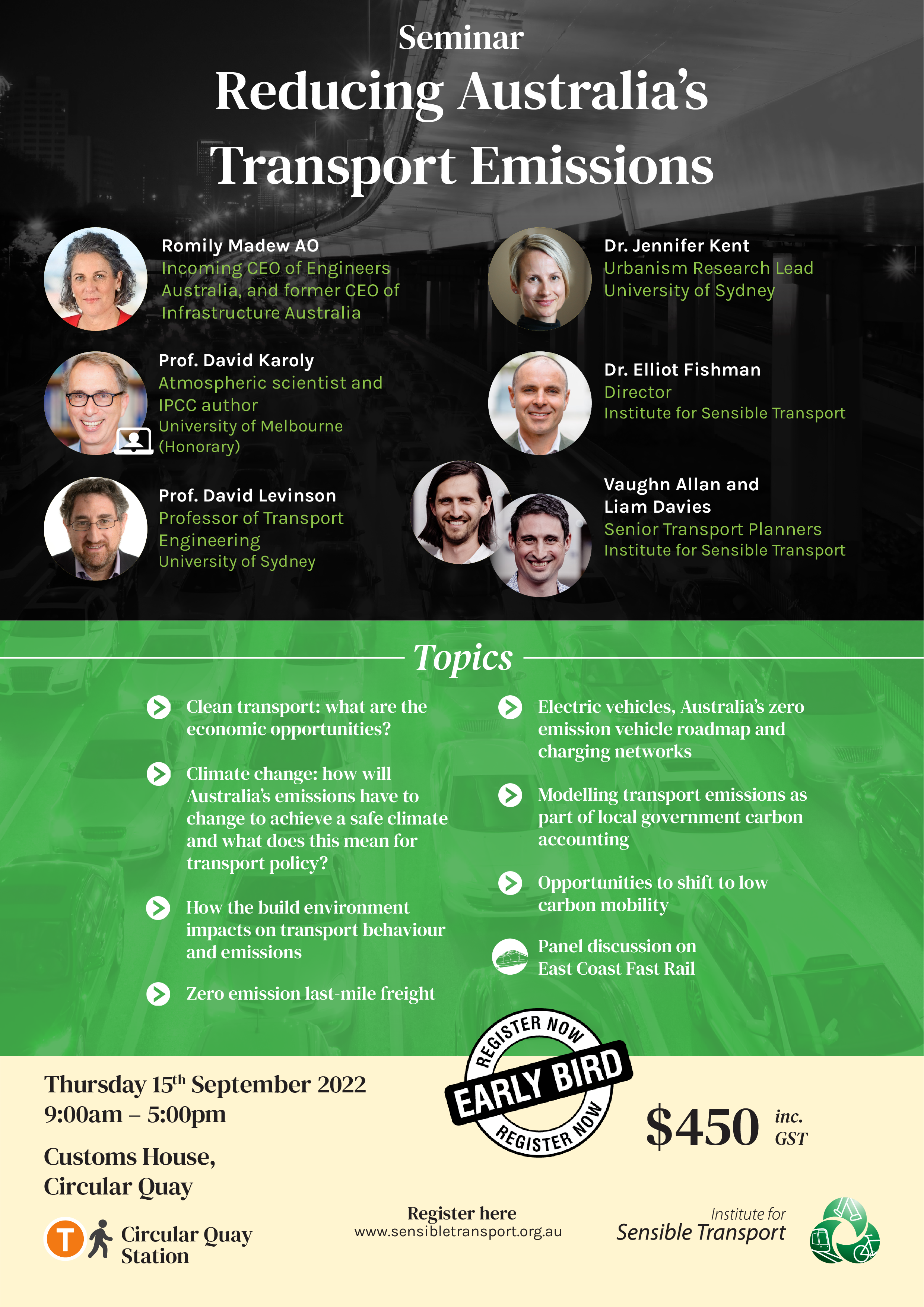 This one day seminar brings together some of Australia’s leading thinkers and policy makers to highlight practical, evidence-based solutions to reducing Australia’s transport emissions. The focus is to provide you with pragmatic strategies for lowering transport emissions.