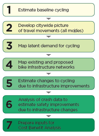The Bicycle Network Model can be simplified into seven key steps, as shown in the figure on the left. The primary objective of the Model is to make it easier for government agencies to understand how proposed changes to their bike network will influence ridership and safety, and have a better understanding of which corridors offer the best prospects for enhancing sustainable mobility options. A useful outcome of the Model is that it provides the fundamental inputs to conduct cost-benefit analysis of the proposed network developments.