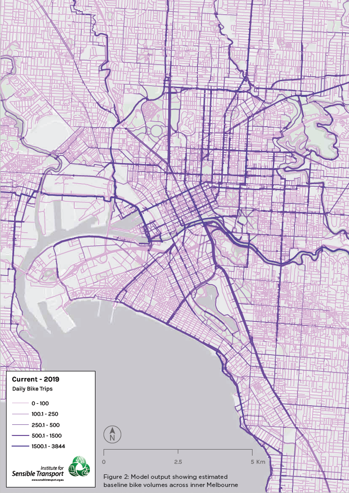 - How much cycling takes place on a city’s street and path network now, and how would this change with enhancements to the quality of the bicycle infrastructure network?