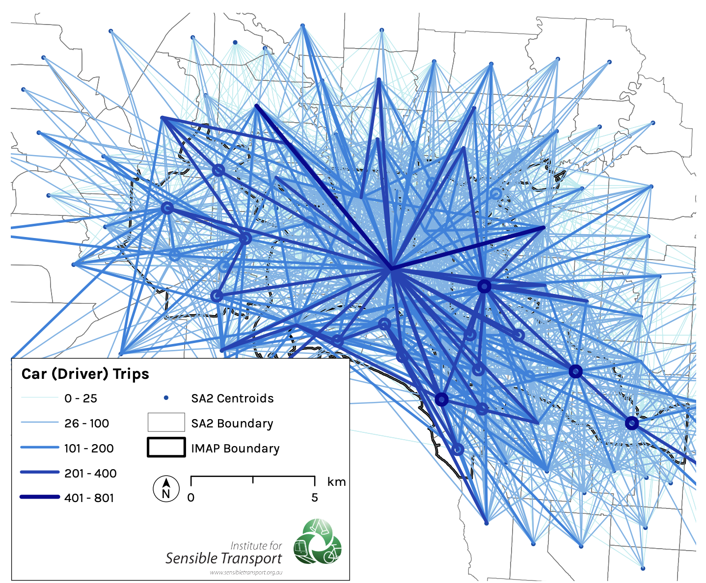 As an example, the map below shows the graphical distribution of car driver trips between suburbs for trips to work. This is used as a starting point to understand the potential shift towards cycling. The circles that can be seen in the map below indicate trips that start and end within the same suburb, whereas the lines represent trips between different suburbs.
