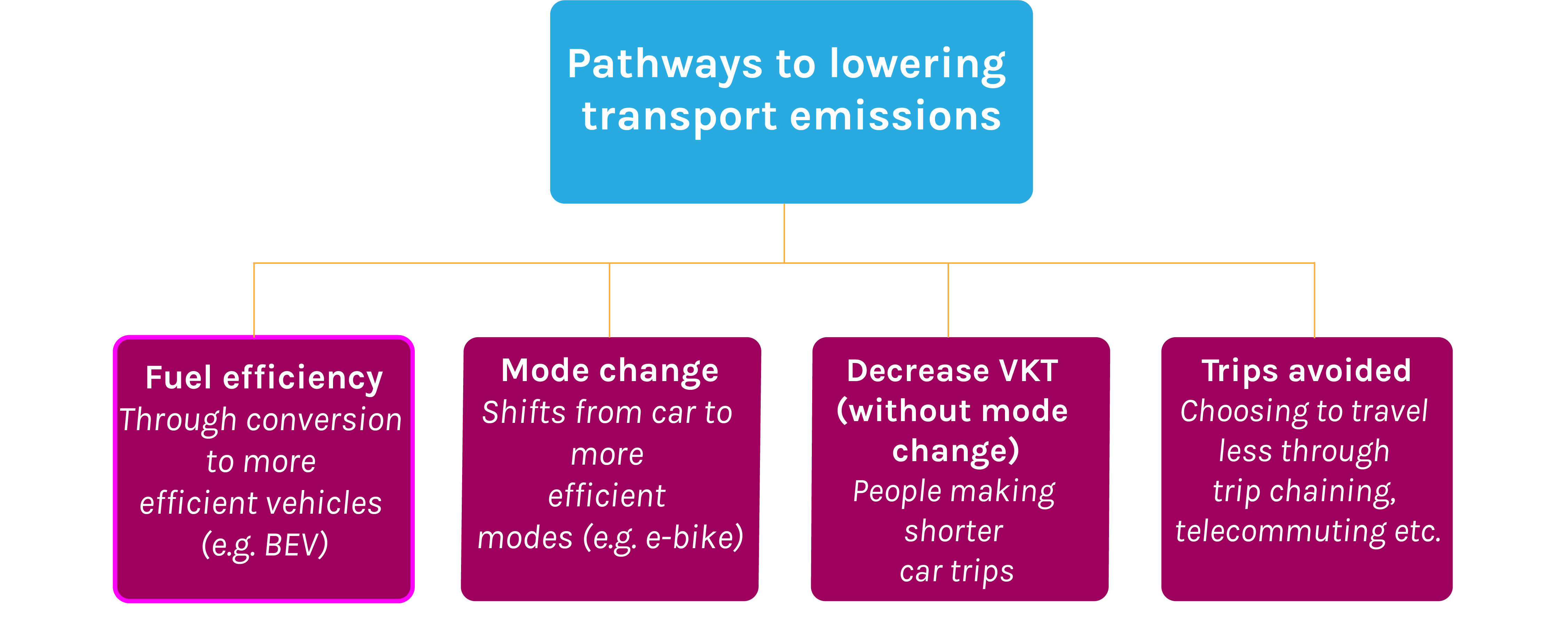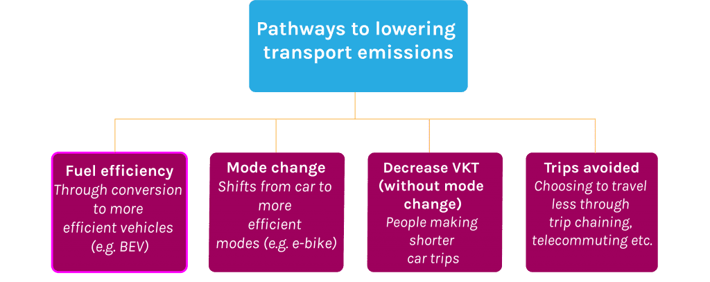 In partnership with SGS Economics and Planning, we led this project for the City of Port Phillip, to prepare their transition to a zero-emission fleet by 2028. This project involved a detailed analysis of best practice electric vehicle charge examples, from both Australia and overseas, and an audit of the Council’s existing fleet. The figure below highlights the pathways through which transport emissions can be lowered. Electric vehicles can support moves for a more fuel-efficient fleet, as shown below. Transport emissions in Australia are currently increasing, and it is likely all of the four pathways will be needed for Australia to bring down its transport emissions.