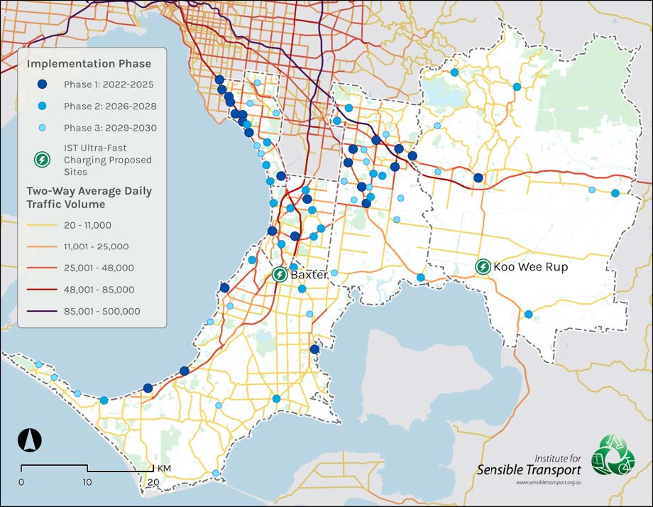 Our Roadmap included a detailed set of prioritised locations for future charging infrastructure. This included a combination of medium to fast chargers, as well as Ultra Fast Chargers at Baxter and Koo Wee Rup, to service high-volume roads with vehicles travelling large distances. The locations are colour coded, based on their implementation phase