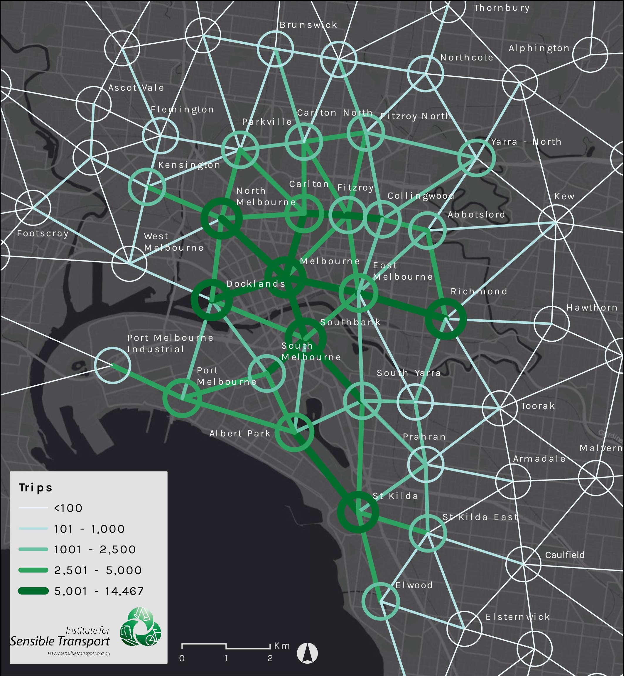 Several noticeable corridors appear from this analysis. An east-west corridor between North Melbourne and Abbotsford is apparent, with approximately 22,500 trips between the four segments. The second east-west corridor runs from Richmond, through East Melbourne, to Docklands via the CBD. This has approximately 21,300 trips across it. The St Kilda Road and Swanston Street corridor, between South Yarra and Carlton, has 13,500 trips. St Kilda to Albert Park is the final corridor that emerges from the analysis, with 14,500 trips between the two suburbs.